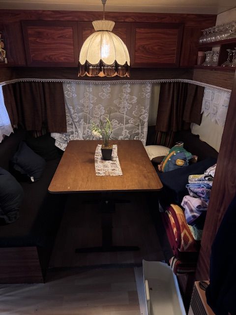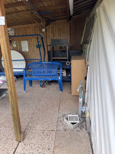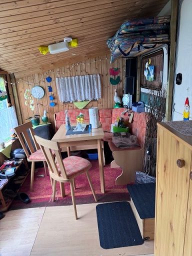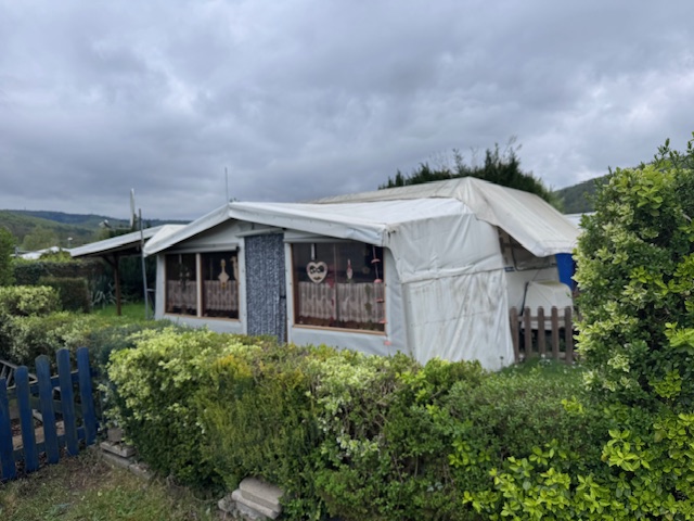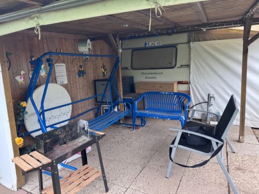 Es stehen zwei Wohnwagen, ein festes Vorzelt was mit Holz innen verkleidet ist, ein Pavillon aus Holz, sowie zwei Schuppen auf dem Platz.